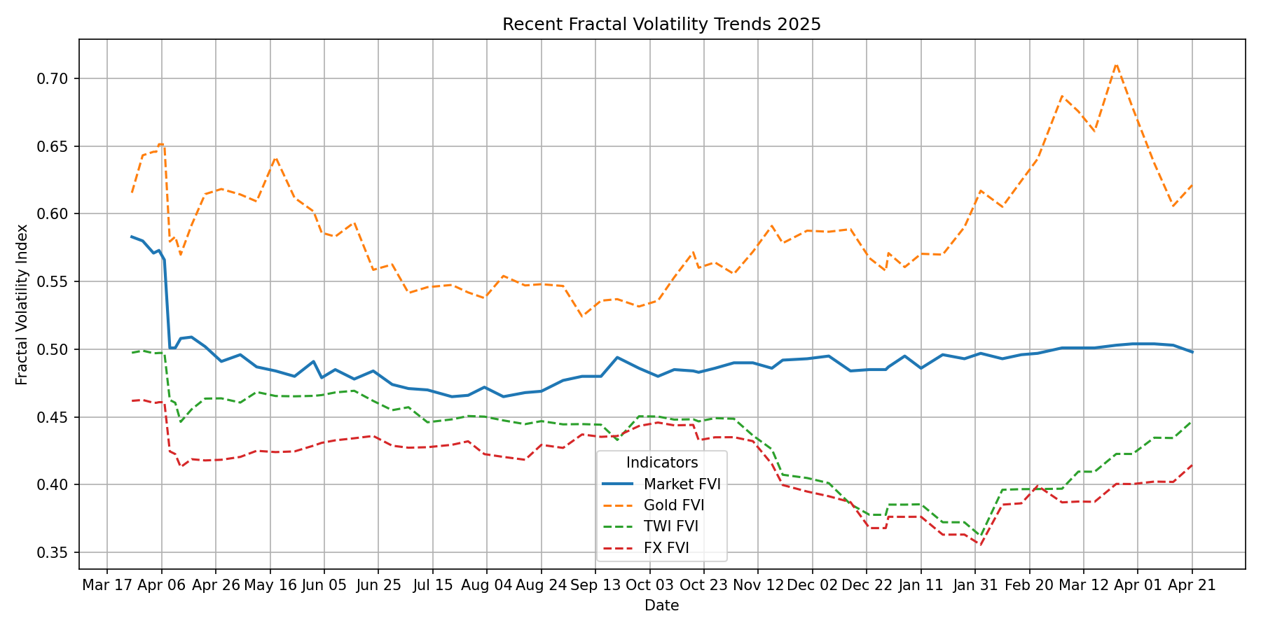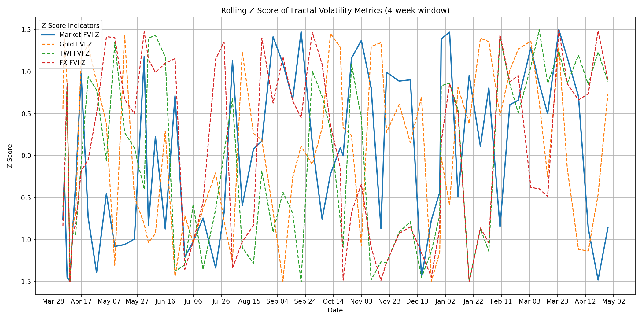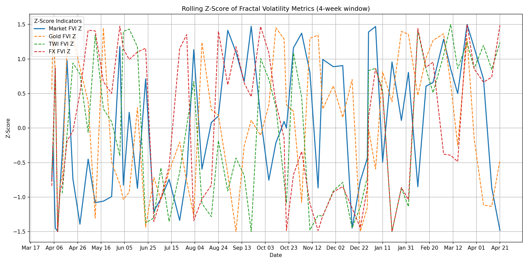 💥Market Metrics🌀 Weekly Fractal Volatility Report – 21 April 2026🔍 📊 Volatility Watch – 28 April, 2026 The Compression Pulse: Markets Phase Transition 🎷 The Poetic Truth: 🌐 Market Intervention continues apace in 2026: The jingle of money has all but disappeared. Short-sighted thinking remains in place. This week’s fractal volatility charts delivered a message that’s hard to ignore: the market, the Trade Weighted Index, and Foreign Exchange are no longer living on the same planet. FX volatility has collapsed to its lowest in months — an unnatural calm. Gold volatility is still rising, signalling doubt creeping into the system. The TWI has broken formation entirely, peeling away from both FX and equities. And stocks? Still floating upwards like nothing is happening. In fractal terms, this is what a regime break looks like. April, June, August, October, and then December — five deep compression events this year — each one a foreshock. Systems don’t tighten repeatedly without a reason. The synchrony we saw in early 2025 is gone. In 2026, we’re looking at structural divergence across the major macro signals. When markets start improvising in different keys, history teaches us one thing: a transition phase is underway. And for those paying attention, the charts are already talking. Take a look at the four-way fractal Z-score chart: Gold volatility is rising — a classic geopolitics barometer. FX volatility is falling — signalling currency complacency. TWI volatility is drifting — tariffs and trade no longer reflecting reality. Market FVI is climbing — the wave building offshore, unseen from the beach. All four should show some relationship. Instead, they’ve broken into discordant paths — like four instruments improvising in different keys. This is what happens when policy, markets, and macro signals lose coherence with one another. The System Is Speaking Clearly Now The market’s Fractal Volatility Index has been grinding downward since April, with no relief. FX and TWI keep pretending everything is calm. But gold refuses to play along. Gold volatility says: “Instability growing.” And today’s compression point confirms it. Today’s market signals are unvarnished. And the compression pulse is real. Verv Stock Reports will continue tracking the compression pulse as it evolves. Hold fast. The pattern is emerging. |